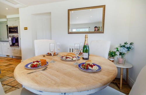 Amenities: Gas central heating with gas fire. Electric Esse cast iron range cooker, oven and hob, microwave, Miele fridge/freezer, washing machine, tumble dryer, dishwasher. TV, WiFi, selection of books and games. Fuel, power and starter pack for woodburning stoves inc. in rent. Bed linen and towels inc. in rent. Highchair and cot available. Ample off-road parking. Enclosed rear garden with lawn, patio with barbecue, furniture, swings, play frame, chickens, sauna, hot tub and outdoor shower. Full-size tennis court. Fire pit. Apple, pear, plum, fig trees and seasonal veg garden for guests use. Pet-friendly. Sorry, no smoking. Shop 1.2 miles, pub 0.7 miles, 2 x Michelin-star restaurants nearby. Note: The second double bedroom has a step up to its en-suite, please take care