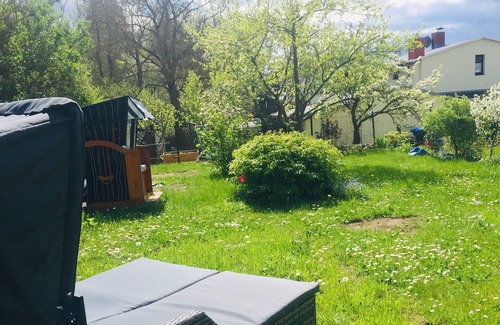 On this floor there is a spacious family bedroom with two single beds (Fiete 1) or a double bed (180x200 cm) (Fiete 2) and a bunk bed (2x90x200cm) in each. Another master bedroom ( double bed 180x200 cm) with view into the garden towards the park "Brunnenaue". Another bedroom for another two guests (double bed 180x200 cm) with another TV. Also you have a large bathroom with bathtub, shower, two sinks and hairdryer. All living rooms and bedrooms have windows with privacy and insect screens.