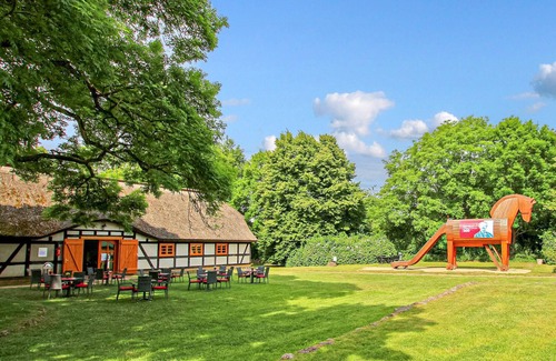 Idyllically situated next to the neighbouring estate park in Friedrichsfelde, only a 10-minute walk from the Müritz National Park, there are 4 guest rooms for a total of 7 adults and 1-2 babies on the upper floor of the old manor house and a restaurant on the ground floor offering breakfast (for a fee) as well as a restaurant serving regional, home-style cooking and homemade cakes from Wednesday to Sunday (11 am to 8 pm).The Schliemann Museum with the famous Trojan Horse is only approx. 600 metres away, a restaurant approx. 1 km and a beautiful swimming area on the Mühlensee approx. 5 km. Shopping facilities can be found in Möllenhagen (6 km) or in Penzlin (10 km). The popular Berlin-Copenhagen long-distance cycle route runs directly through the village.