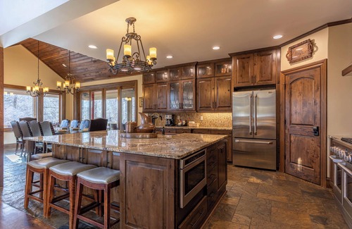 On this level are also a large fully-equipped kitchen featuring spacious granite counters and a large granite and wood paneled island with seating for 6 that offers plenty of room for your group whatever the occasion. The island also features a large copper sink, a microwave oven, and 2 dishwashers. Also featured is a 6-burner gas range with double gas ovens, griddle, and warming shelves.