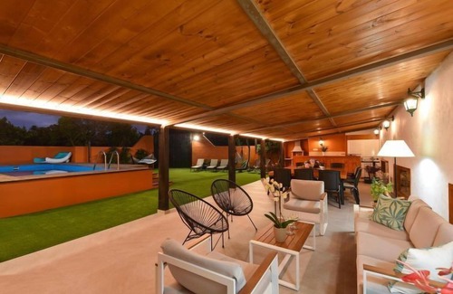 "Finca La Casona de Abajo Arucas", 6-room house 280 m2. Comfortable and rustic furnishings: living/dining room with dining table and digital TV. Exit to the patio. 4 rooms, each room with 1 french bed and shower/WC. 1 room with 1 french bed. Kitchen (oven, dishwasher, 4 ceramic glass hob hotplates, toaster, kettle, microwave, freezer, electric coffee machine) with dining table. Shower/WC. Patio. Terrace furniture, barbecue, deck chairs. View of the swimming pool and the garden. Facilities: washing machine, safe, iron, children's high chair, baby cot for up to 2 year olds, hair dryer. Internet (WiFi, free). Please note: non-smoking house. 2022-T16283 ESFCTU0000350100001504340000000000000VV-35-1-00187819