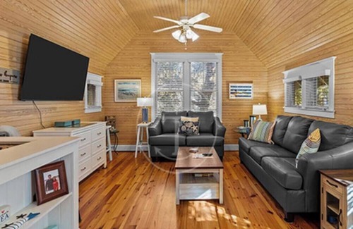 This charming two-bedroom cottage near East Beach sits just across the street from a 400 foot-pier which extends over the marsh on the Bald Head Creek. Small and cozy, this home has a perfectly sized kitchen and enough dining seats for your whole party. This home is a duplex with the shared wall being the outer garage walls, and features a reverse floor plan — with a bunk bed (full bed on the bottom) bedroom on the lower floor and queen bedroom with en suite upstairs along with the kitchen and living area. Very well equipped. Step right across the street to enjoy a serene view of the marsh from the Keeper's Landing dock.