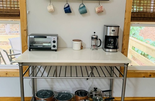 Step away from it all and relax in this newly renovated guesthouse. Only 10-15 minutes from everything Asheville has to offer, this property is the perfect, peaceful setting for couples or small families. Enjoy a stress-free, first morning with local bread and eggs from our chickens. A full kitchen with new appliances and everything you need to cook elaborate meals, an open living area with huge windows looking out at trees and gardens, all make this the perfect sanctuary.