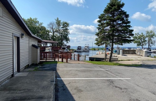 This apartment was once part of a restaurant on the premises. It still has some of the old décor. It is right on the water, part of a 50 unit marina. Step outside onto the deck and right into your boat for a day of fishing on Oneida Lake. Your unit comes with one slip, a second is available for a minimal fee. Everything is on one floor. Living room, eat in kitchen. Laundry room. Large master bedroom, den with two twin beds. Linens, towels, stocked kitchen.