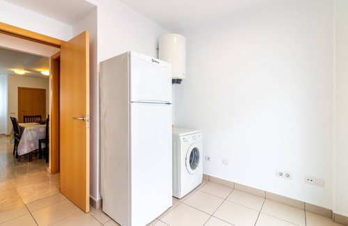 In the vitroceramic open plan kitchen, refrigerator, microwave, oven, freezer, washing machine, dishwasher, dishes/cutlery, kitchen utensils, coffee machine, toaster, kettle and juicer are provided.