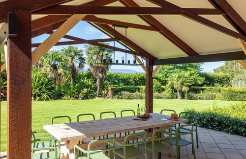 Set on a quiet country lane and surrounded by farmland, Fletchers Lane Escape is the perfect luxury rural getaway with all the modern comforts. Spend quality time with your extended family or group of friends while taking in stunning escarpment views from the 2.5 acres of manicured gardens or enjoy a refreshing dip in the swimming pool. The outdoor pavilion seats 12 and features a large gas BBQ and dining area, perfect for alfresco meals. For active guests, there’s a tennis court with basketball and netball courts, and a trampoline to keep everyone entertained. Whether you’re relaxing poolside or playing a match, the tranquil rural setting ensures a sense of serenity.