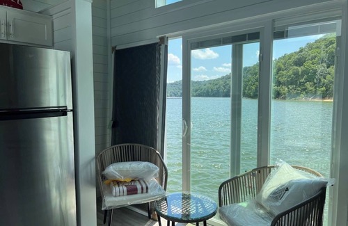 Check out this brand new Floathouzz right on beautiful Lake Cumberland! The blue Tiny XL can sleep the entire family, friends and more! On the main level you have a full kitchen, living room with tv and sleeper sofa, master bedroom with a kind bed and master bath, and a secondarily bathroom. On the lower level you have 2 bedrooms each including 2 queen size beds. The loft is the perfect place for all the kiddos featuring 3 queen beds and a twin bed!