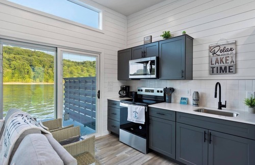 Check out this brand new Floathouzz right on beautiful Lake Cumberland! The Gray Tiny XL can sleep the entire family, friends and more! On the main level you have a full kitchen, living room with tv and sleeper sofa, master bedroom with a kind bed and master bath, and a secondarily bathroom. On the lower level you have 2 bedrooms each including 2 queen size beds. The loft is the perfect place for all the kiddos featuring 3 queen beds and a twin bed!