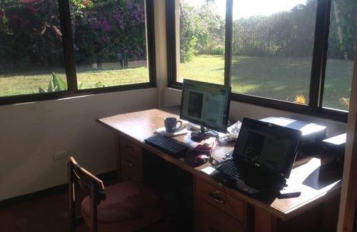 US owner offers this 3 1/2 BR 2 bath newly remodeled and expanded home on the east side of Santo Domingo, Heredia, on a half acre with ample flower gardens, fresh flowers every day, many kinds of birds in the yard (106 kinds identified so far), ideal year-round spring-like temperature zone, at an altitude 1500 ft above the mosquito zone. Spring weather year round (mid to high 70's/23-26 C, never too hot) 3 1/2 BR 2 Baths (showers only, no bathtub)--Pool table, ping pong table and huge outdoor kitchen, all on one floor, porch side entrance has no steps. Rich wood panels on high ceilings with large central skylight, ceiling fans in all rooms (opening window adjusts temperature with gentle natural breeze), 9-foot regulation mahogany pocket billiard table with one inch Italian slate, 45 by 14 ft skylighted teak ceiling front porch, outdoor kitchen with Weber for charcoal briquets and large gas grill and sink, New spinning exercise bike, sun porch ringed with flowers, large glassed-in separate dining room-office with large desk, computer monitor, printer, surrounded by walls of blooming flowers, guest parking, open floor plan, 300 Mbps fiber optic internet and cable TV, backup internet is 100 Mbps fiber optic, TWO simultaneous Wifi internet systems exclusive to this house (not shared with any other house) to drive ALL your devices simultaneously and run clear Skype/Whatsapp video calls, Youtube, Netflix, 55 inch smart TV hooked to wifi, sun porch with rocking chairs, gravity chairs, large umbrella and round table, views of coffee fields and surrounded by lawn and flower gardens, 20 minutes to the new (2013) Lincoln mall with first-run movies and top restaurants, 30 minutes to the new (2018) Oxigeno mall, 30 minutes to National Theater and the museums, 10 minutes to the Brumas del Zurqui coffee shop with the coffee judged best in the world in 2012, 14 minutes to the award winning Bougainvillea Hotel gardens and restaurant, 12 minutes to the Toucan Rescue Ranch exotic animal park. 15 minutes to the Bromelias del Rio restaurant and bakery, 18 minutes to the SIBU organic chocolate factory, restaurant and tour, 30 minutes to the Britt coffee tour farm and packing plant, 60 minutes to the Jungle Tram (Rainforest Adventures) or the ZooAve bird sanctuary, 1.5 hours to the Lankester Gardens or to the Sarchi woodworking town, 2.5 hours to either Atlantic or Pacific beaches. New teak cabinets, new teak bedframes with Guatemalan bedspreads, big closets, US appliances including new dishwasher (rare in Costa Rica), new clothes washer, electric dryer, kitchen eating bar for 6, functional stone fireplace (never used-never cold enough), new curtains, new (2022) spinning type exercise bicycle and weights, fully furnished and equipped, fully screened but well above the mosquito altitude zone, covered parking for 2 cars, electric gate with remote control, part time handyman-gardener-mechanic, sleeps 6, just bring your wireless devices and clothes, No smoking No pets.