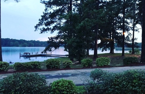 Enjoy your own cove on a private lake. Fishing, kayaking, swimming, walking trails, playground, beach, outdoor private pavilion with fireplace, gorgeous secluded setting on 12 acres. Three master suites on the main level. Bathroom, two large bedrooms, library, more game rooms upstairs. Updated kitchen, nicely furnished, comfortable beds, 10 covered parking spaces. 4650 sf of indoor airconditioned space. Deck over the water. Fishing pier