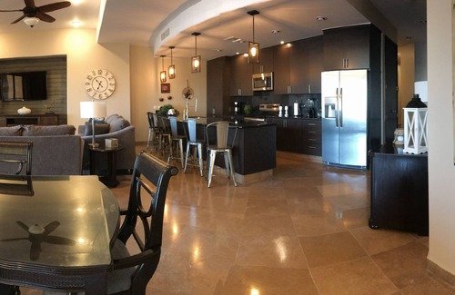 Welcome Cabrillo G307, Located in phase 2 nestled on the 3rd floor of Las Palomas. Recently Remolded 3B/3B with new Stainless Steel appliances And Brand Spanking New Furniture! CABIE (cabrillo) offers 2,200 Sq.Ft of spacious living and sleeps 8. There are 3 luxury bedrooms with king size pillow top beds . The two master baths have stunning travertine all around, with cozy soaker tubs and roomy walk in showers. The third bath has a double sink vanity as well and a large walk-in shower with travertine all around. The kitchen offers an exquisite oversize island for prepping and entertaining. Cupboards are stocked with everything you need to make your own meals. In addition We offer a blender and a Black & Decker 12 cup Coffee maker As well as a Keurig K-cup coffee brewing system. The dining area seats 6 Comfortably, along with the island that seats five in case of overflow. A joining is an Spectacular living room for family and friends to relax and unwind. There are two comfy sofas (one of them being a queen size sleeper). There is a 65” Flat Screen Tv mounted to the wall and an inviting fireplace below it. Games for some family fun are located inside the cupboards of the fireplace. Off the living room are slider doors that lead to a Spacious balcony with Astonishing Panoramic Views of the ocean. The beautiful handmade stone dining table seats 8 and a high-top table for watching the sunrise and sunsets. CABIE also has a separate laundry room which is equipped with full-size Kenmore washer and dryer. Included is covered two story garage for parking and easy access to the elevators.