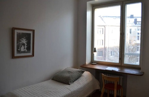 Luxurious four-room apartment with an open view to Töölöntori (Töölö market place). 5th floor, elevator. 4 rooms + kitchen, bathroom and wc. Wireless internet. 6 sleeping places. Breakfast downstairs in Café Tin Tin Tango for extra charge.