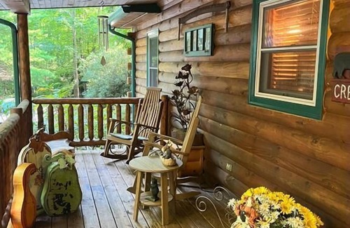 Entertainment elements include Big Screen TV, DVD, satellite system with movie channels, and stereo systems.The large four season back porch overlooks the creek, with handcrafted log furniture including Amish swing. But the magic of Creeksong lies outside, along the creek. Picnic in the gazebo. Swing in the hammock. Sit around the fire pit on the rock benches. Try out the loungers on the flagstone patio on the creek bank. Grill out on the covered rock and tile patio. Relax in the hot tub overlooking the creek. At night, you can flip a switch and light up the whole creek! The sight of cascading waters and moss covered boulders underneath a canopy of mountain laurel & rhododendron awaits you at Creeksong.
