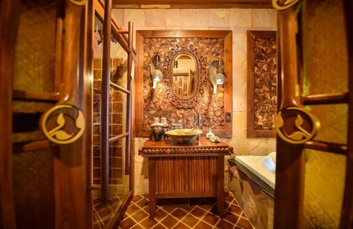 Step into the enchanting world of Fuji Suite, where tradition meets comfort. Nestled on a hill within an elegant Thai-style structure, this suite invites you to unwind with direct access to the expansive Saaitara pool right from your private veranda adorned with intricate Thai arch carvings. Revel in the serene ambience of the mountains and tropical coconut groves while lounging on unique sunbeds designed to enhance your relaxation experience.