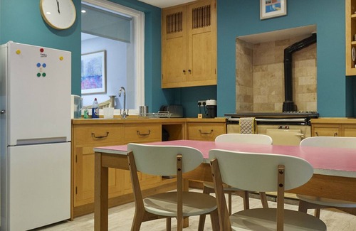 Patio doors open from the bedroom to the walled courtyard garden where you will find a wooden table and 4 chairs. In the summer months, the AGA cooker and oven is turner off as its make the apartment too warm. So there is an induction hob and a counter top single oven. The AGA is on in the autumn and winter months.