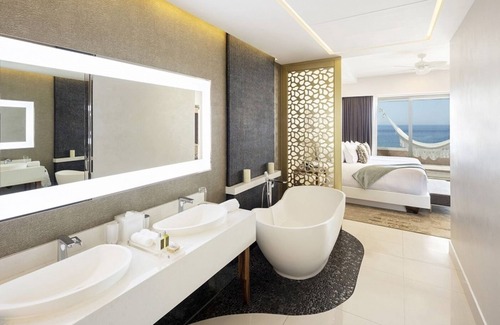 The contemporary design of the 1,313 square foot One Bedroom Suite incorporates a variety of textures and tones with the purpose of enriching the guest experience while living in the space. The design concept is based on marine life. As you walk in, you will notice a stunning gourmet kitchen, complete with upscale appliances, a dining area that seats 4, and a living room with an entertainment center, a sleek 55-inch flat screen TV, a sofa bed, and two lounge chairs with the geometry of coral. The middle table is a vault representing some type of treasure found in the depths of the oceans. Next to the kitchen, there is a full bathroom with a shower and washer and dryer for your convenience.