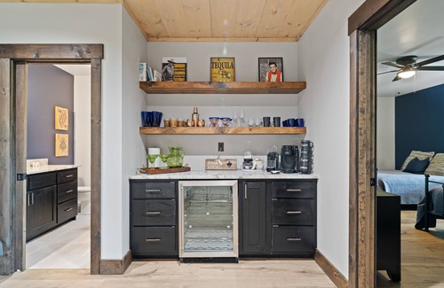 The four bedrooms have been lovingly decorated with warm color palettes, wilderness-themed decorations, and high-quality linens. The sizable bathrooms are spa-like with their tiling, dual sinks, and walk-in showers. Additionally inside, appreciate having access to a private washer/dryer and central air-conditioning.