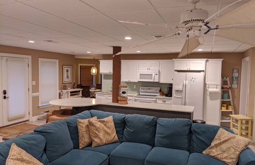Just beyond the Grand Foyer on the Main Floor, stairs lead down to the 1600 sq ft lower level Cabana, which is a completely renovated apartment with its own fully equipped kitchen, breakfast nook, queen bedroom, full bath, and a TV lounge. The pool, spa, and lower deck are best accessed from this level. If required, a Craft Room adjoining the Cabana Bedroom can accommodate an inflatable queen size air bed for additional guests.