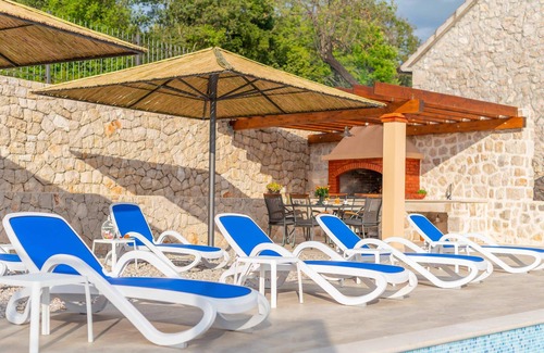 Villa Danica is an authentic Dalmatian stone house in a secluded quiet place on a hill without city electricity and water. However, the home charm is self-sustaining which provides guests complete comfort thanks to natural ecological sources of power and water. The complete comfort of hot and cold water and electricity is ensured. On the ground floor is a kitchen, dining room and living room. Charming wooden kitchen equipped with stove (without oven), sink, dishes for eating and drinking, fireplace for barbecuing. The chimney is an isolator from the smoke in the house. In the winter, the fire from the fireplace warms water in the radiators in the house. A large dining table provides an old time feeling, when families and friends dined together and created common memories. The living room has a TV, couch which serves as an extra bed for two additional persons. The bathroom is equipped with a bath tub, toilet, boiler and shower. The exterior features a pool with deck chairs, umbrellas and a shower, a terrace with outdoor furniture, an outdoor fireplace, an outdoor sink, a children's playground and a parking lot. The wrought fence provides intimacy and luxury.