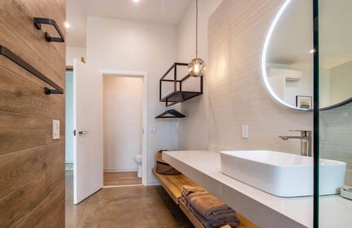 One of the suites on the premises, unique luxury accommodations near Yosemite National Park. Brand new, high end construction on 60 acres with spectacular views. Each bedroom is a private suite, with ensuite bath, soaking tub and private patio with unobstructed views. Beautiful living & dining area with open kitchen. Expansive patio area for outdoor dining and socializing. Relax and enjoy the view from the swim spa and hot tub. Make your forever memories at Horizon by Yosemite!