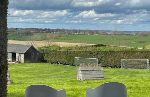 De living grenst direct aan het buitenterras met weids uitzicht over de grote weide die tot het complex behoort en op het Limburgse landschap. Daar is heerlijk genieten van een etentje en een drankje. Ben je met kinderen, dan kunnen die naar hartelust spelen in de weide en kun je ze toch in de gaten houden.