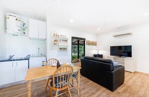Inside you’ll find a living room with a two-person leather couch sitting opposite a flat-screen TV. A cosy bedroom has black-out blinds, built-in cupboards and a plush queen bed. There is direct access to the outdoor rear deck, providing an alternative private space and a view of lush greenery through the bedroom’s glass door. A spacious bathroom features a generous shower and a large vanity.