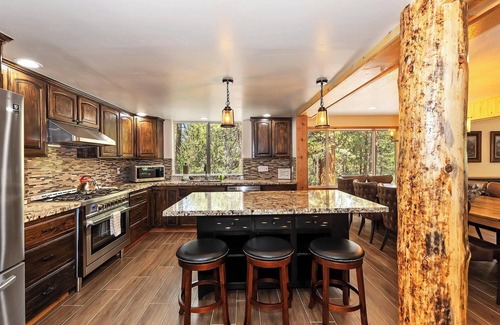 The main living area welcomes you with soaring vaulted ceilings, rich wood beams, and a cozy lodge ambiance. Sink into the plush leather sectional or one of the four armchairs surrounding the stone fireplace, and enjoy a movie night on the mounted flatscreen TV. Massive picture windows frame beautiful views of the surrounding pines and bathe the space in natural light.