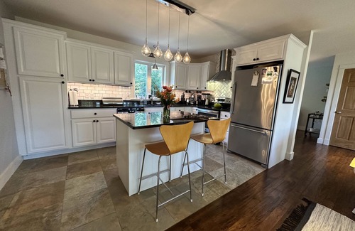 The 1500 sq. ft. house features a beautifully appointed living room, open kitchen with spacious island, dining room, and 1/2 bath on the first floor. There are 3 bedrooms (master king with en suite toilet/shower, queen, and a bedroom with two twins) on the second floor. There is also a full bathroom, and a bathroom with shower only (king en suite) on this floor. Hot water is on-demand. Heating is radiant through floors on the first floor and baseboard upstairs. Ceiling fans in king and queen bedrooms, floor fan in twin provide cooling.
