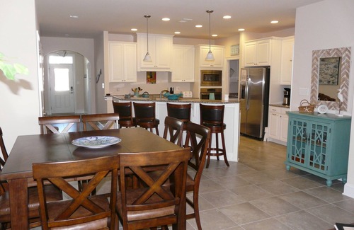 This custom decorated 5 bedroom, 4 ½ bathrooms Villa offers luxurious accommodations with plenty of living space for your family with sleeping accommodations for up to 10. The first-floor features include 10 foot ceilings, arched entryways, dining area to seat up to 12, also comes with a baby high chair, a gourmet kitchen with upgraded granite counter tops, stainless steel appliances, two coffee pots (drip and k-cup) there is also a coffee bean grinder, a 4-burner cook top, oven, microwave and gorgeous cabinetry. The home has all new furnishings and luxury bedding throughout the home. Tile flooring and soft carpets adorn the home throughout.