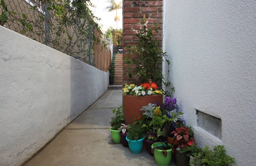 The suite offers lots of light, blinds, queen size bed, 2 flat screen t.v.'s with all the cable channels, Wi-Fi, dining table, couch, coffee table, refrigerator, microwave, coffee & tea maker, toaster, dishes, drinking glasses, utensils. The self contained suite is in the upper section of the house. It is +/- 500 square feet, total space, The unit is separate and you enter and exit through your own private entry way on the side of the house, up one flight of stairs to a private deck. Private bathroom connected to the bedroom. Laundry is available on-site on Tuesdays + Thursdays from 5-8PM. Laundromat is located at 8111 W. Manchester Blvd. Open daily 7AM - 10PM.