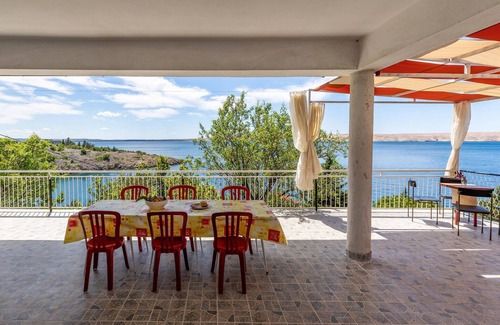 Welcome! The sea is at your feet and welcomes you to this well-equipped holiday home. Enjoy the ambience of modern and classic furnishings and find everything you need to relax and unwind. Conjure up delicious dishes in the kitchen or barbecue outdoors. Linger on the large and partially covered terrace, which offers you a marvellous sea panorama with a view of Pag. Take advantage of the location and walk down the steps to the bathing area and dive into the crystal-clear sea.
