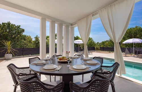 If you are looking for a villa for a peaceful vacation, Villa La Vie Krk is an excellent choice. The villa can accommodate up to 8 people in 4 bedrooms. There are three bright and cozy bedrooms on the second floor of the villa. All rooms are air-conditioned, have a double bed and TV and each has an exit to the terrace where you can relax with a good book or enjoy the beautiful view of the surroundings. Two rooms have their own bathroom, while the third uses an additional bathroom, which is also located on the same floor. On the first floor of the villa you will find another bedroom with en-suite bathroom, double bed, air conditioning and TV. The room has direct access to the garden. On the first floor there is also a living room with TV, which is connected to the dining room and a fully equipped spacious kitchen in an open space concept. The entire area is air-conditioned. From the living room you can access the villa's garden with a swimming pool to cool off on hot summer days and sun loungers where you can relax and enjoy the sun with a refreshing drink. Next to the house there is a covered terrace with a dining table where you can enjoy meals with family and friends that you have prepared on the barbecue, which is also at your disposal. The property is fully fenced and has private parking for 5 cars. Book your accommodation in Villa La Vie Krk and spend a perfect vacation with family and friends. Villa La Vie Krk is located in the small village of Garica on the island of Krk in the Kvarner Bay, which is considered one of the most attractive and beautiful destinations on the Adriatic. A good connection to the mainland (bridge), an excellent tourist offer, various beaches with small bays, beautiful nature and various possibilities for fun and relaxation make Krk one of the most interesting tourist destinations on the Adriatic. Garica is a typical island village - located in the central part of the island, peaceful, quiet and surrounded by beautiful nature. Among the island's special features are 2,500 hours of sunshine per year, hundreds of kilometers of hiking and cycling trails and over 1,400 plant species. Visit Vrbnik, a small town with almost 900 years of history. Vrbnik is also known for its famous Vrbnicka zlahtina. Don't miss the island of Kosljun, a unique cultural and historical place not far from Punat, as well as the town of Krk and the famous Frankopan fortress, located in the historic center of the town. We recommend a visit to the almost kilometer-long Vela beach in Baska in the south of the island. The island offers many different beaches and no matter which one you choose, you won't go wrong! The temperature of the heated swimming pool depends on external factors, including weather conditions, and therefore the water temperature cannot be guaranteed.