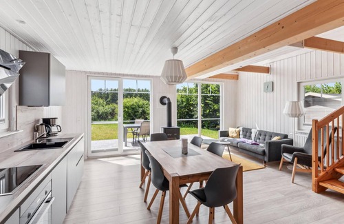 The vacation home is situated in a quiet location in the vacation village with a beautiful view over meadows and fields. Thanks to the galleried second floor and the panoramic windows that extend from the floor to the roof, the house is particularly bright and friendly. The two separate bedrooms are each equipped with a cozy double bed. There is space for a child's travel bed in both bedrooms. This and a child's high chair are available in the house. On all windows and on the patio door there is a professional insect screen that can be opened.