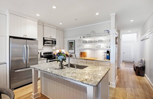 Step into a beautifully designed space where stylish details and high-end furnishings create a luxurious yet inviting atmosphere. The open-concept living area filled with natural light invites you to unwind in luxury, while the fully equipped gourmet kitchen with upgraded high end, stainless-steel appliances and central granite topped island makes entertaining and meal preparation a breeze. There is a large eat-in kitchen table that includes unique built in bench seating and chairs to seat everyone comfortably. The living area is roomy and comfortable, offering one huge wall with a view of the tidal marsh. It is impeccably decorated with two couches and a club chair which swivels to accommodate conversations, reading, watching the LCD Flat screen Smart TV, or listening to your favorite tunes on the Sonos sound system. Xfinity cable is included as well as capability to stream movies through your favorite providers.