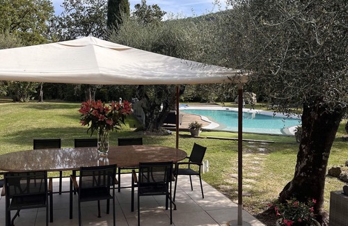 Villa Les Lucioles is the perfect property for a large family or group of friends. It enjoys a large, flat, & completely enclosed garden with lovely views of the surrounding mountains. The large pool has a great shallow pool area, perfect for children to play in. Around the pool patio are many sun lounger’s for those wishing to relax & soak up the sun & a shaded outside lounge area. Inside the villa, most of the living space is on one level. The kitchen & dining room open directly onto the garden/pool area. There is shaded eating area right outside the kitchen which overlooks the pool. The living room is spacious & bright. It opens onto the smaller garden which has a nice quiet courtyard. There are 4 bedrooms on the main level, one bedroom in the character tower room & the sixth bedroom on the ground floor. All bedrooms have air conditioning. Pool heating is possible, please ask for price. Villa Les Lucioles is walking distance into the village of Bar sur Loup (approx. 20 mins.) where there are several restaurants, shops, & outdoor markets.