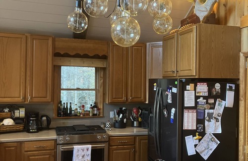 Kitchen offers dual-fuel stove (gas cooktop with electric oven), full-size washer/dryer area, plenty of cookware and kitchen gadgets, toaster oven/airfryer combo appliance, microwave and all the necessities. Full-size refrigerator here and on lower level for extra storage of items for your feast. Gas grill on covered porch; propane tanks provided. Wood for fireplaces also provided.