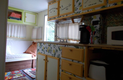 A leading travel magazine says “Tiny homes have a magic to them. There is whimsy and childlike wonder…” Campers are the original tiny homes. Book to “test drive” living in a small structure. This space combines magic and whimsy with maximum functionality. It has all you need: full bath w/shower, hot water, kitchen, refrigerator, living area and a dining areas, 2 beds, linens , porch with table, 2 gardens w/lawn chairs. Great mountain views, star gazing. Glamping at its best.