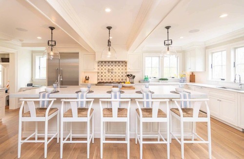 POINT B EXCLUSIVE - This recently built luxury home features three floors of deluxe indoor living space, with nicely integrated outdoor space as well. The interior architecture and design was overseen by noted Vineyard architect Chuck Sullivan. The first floor features a modern layout with an open Great Room with Living, Dining, and Kitchen Areas, framed by walls of glass windows and doors that open to the outdoor spaces.