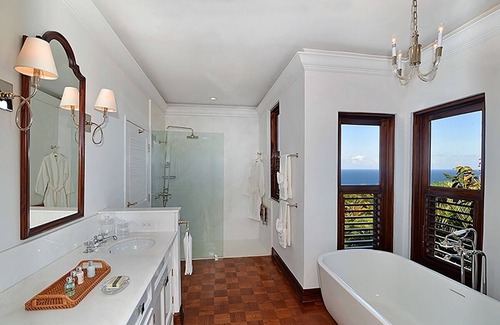 With an ocean panorama that is nothing short of awe-inspiring, this grand ten-bedroom villa with large airy rooms exuding sophisticated style, a terrific infinity pool, a cascading garden waterfall, children’s playground and the choice of outdoor or indoor air-conditioned living make this a one-of-a-kind villa. Occupying a commanding elevated location, Villa Amana offers magnificent ocean views and a backdrop of deeply forested hills and is just a short journey in one of the complimentary golf carts to all the amenities, legendary golf course and beach. Built in a striking colonial style with white-rendered walls, the villa is on two levels offering large rooms and a backdrop of tropical hillside forest. To the front, the commanding ocean view is truly spectacular and because of the elevation, at certain times of the day the curvature of the earth can be seen. The large circular courtyard entrance to the villa is backed by a spectacular hillside garden with a lovely water feature that cascades down. The bedrooms are very spacious offering air conditioning as well as ceiling fans. Most are designed to maximize the spectacular views with huge windows and private balconies. En-suite marble bathrooms with travertine floors accompany each bedroom with the master bathroom being clad in a beautiful white marble. All of the bedrooms are furnished with beautiful Jamaican mahogany four-poster beds. There are eight bedrooms in the core of the villa; two upstairs including the master and six downstairs. A further two bedrooms, both with king beds are in the west wing; one upstairs and one downstairs. Throughout, the white walls are accented with beautiful fabrics from Nina Campbell, Schumacher and Brunschwig and Fils. The main balcony of the villa easily accommodates 50 people for a cocktail party and is the natural lounging, entertaining and dining spot. A combination of modern rattan furniture and white upholstered sofas and armchairs invites relaxation and the mahogany dining table can seat 20 guests. The formal, air-conditioned dining room can seat 20 guests at the bench made mahogany table with elegant pineapple-back dining chairs. There are spectacular views out to sea as well as across the swimming pool and to the hills beyond. The large and exceptionally high-ceiling sitting room has three wide and tall openings onto the veranda bringing the stunning view of the ocean inside. These openings can be closed allowing the room to be air-conditioned if so wished. Comfort prevails with conversational groupings of large sofas and armchairs. There is also a grand piano which adds panache to cocktail hour. On the lower floor of the villa is a business office which is well-equipped with a computer, fax machine and printer. Outside is a superb infinity pool with poolside bar overlooking the sea with deep rattan pool chairs and plenty of umbrellas. A dedicated children’s playground with swings, a slide as well as a basketball court is always a hit with youngsters as is the pool table located on an upper veranda. Opposite the playground is a very well equipped private gym.