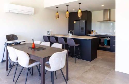Modern table seats all guests comfortably for shared meals.