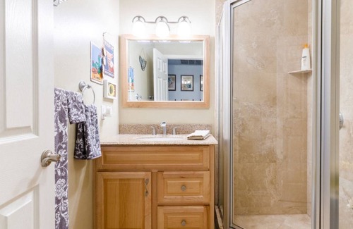 The spacious master bedroom features a King size bed, 43” Smart TV (streaming services only), walk in closet and private bathroom with single sink and tub/shower combo. The first guest bedroom features a bunk bed (2 twin size beds) and a day bed (2 twin size beds), the second bedroom features a Queen size bed. The Guest bathroom has a single sink and walk in shower.