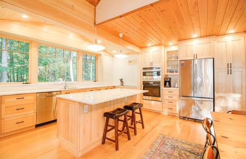 Our home is spacious and luxurious and a relaxed place to hang out. Built in 2002 with a 2023 renovation & addition, everything is new but feels like a classic Maine lake house with wood paneled walls and ceilings, a stone chimney, but all the modern conveniences. Green Lake is 8 miles long with plenty of space for boating and the Northeast cove is quieter & less windy and a great secluded spot to explore the islands, swim and kayak, and watch the loons, herons, eagles and beavers. Pick blueberries off the bushes all along our shore. Eat lunch on the porch right outside the kitchen/living area of out on the 60' long dock while soaking up the sun and the views. You enjoy a 180 degree view of the water from the house; it sits on it's own private promontory with over 550' of lake frontage, private dock, and swim dock. A canoe, 6 kayaks, and 2 stand up paddle boards are available for use. If you need a break from the lake their is plenty of mountain biking and hiking in the area.