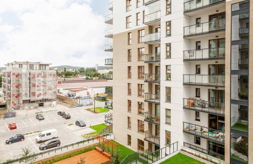 The apartment is part of a modern apartment complex that offers guests possibility of free gym. The building is situated in the perfectly communicated district. This area combines well-developed infrastructure and easy access to the city center with peaceful atmosphere away from the touristic hustle and bustle. The closest neighborhood can fulfill all daily needs thanks to many shopping (a supermarket 800 m away) and catering (a café 240 m away) points.