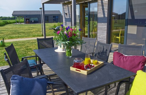The three bedrooms each have a double bed (160x200) and a large built-in closet. If necessary, an extra bed (80x200, for a fee) can be added. Two of the bedrooms are equipped with a 32 "TV. The majestic living room (39 m²) with a ridge height of 5.80 m and gallery on the upper floor has a dining area with open kitchen and bar as well as a sofa area with 40 “TV and SONOS sound bar. The sound system can be controlled via the tablet embedded in the kitchen wall or via your smartphone using the SONOS app. In addition to the shower room on the ground floor, the upper floor has a spacious full bath (18 m²) with a free-standing bathtub, large sauna and balcony. The lounge furniture in the gallery invites you to read a good book or you are simply fascinated by the large panoramic windows into the vastness of Pellworms. All kitchen appliances such as a stove, dishwasher and refrigerator with a 4-star freezer compartment as well as a washing machine and dryer come from Miele. Thanks to a state-of-the-art fiber optic connection, a powerful internet connection is available (e.g. for streaming). The WLAN in the house can be deactivated on request. You can also take your meals in peace on the large terrace area. A terrace table and 8 chairs are available. Three loungers with cushions invite you to sunbathe extensively. The garden offers plenty of relaxation and play space. Even in the cooler months, nature and the house complement each other perfectly. After extensive dyke hikes in the fresh sea air, just make yourself comfortable in the sauna or on the sofa or indulge in what works best here: the well-kept doing nothing!