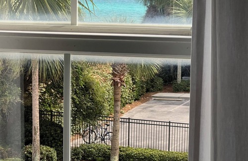 COMPLIMENTARY BEACH UMBRELLAS AND 2 CHAIRS! MILLION$ VIEWS from condo & MILLION$ BEACH access. Coastal chic condo, master bedroom, king size bed, en suite bath, queen sofa bed and kitchenette. Sleeps 4. Located on coveted 30A. 2 Juliette Balconies with opportunities of Gulf blue turquoise views! Perfect for a Honeymoon or Wedding Anniversary! Enjoy multiple water sightings from windows! At ground floor, 10 steps to the open public beach access for ease and convenience. Beautiful new floors! Paint and decor refresh! Downstairs is your beach town coffeehouse, Amor Cafe, where you can grab a beverage or pastry and head across the street to the sugar white sands and turquoise waters of the Emerald Coast. WEST 30A BEST DINING!!! **See photos. Premier shopping for the ladies at Chez Jean Boutique, beach items and swimwear at 30A Surf Club, 30A Mini Market, hair and nail salons. Spa, facials and chiropractor on site! Fun souvenirs are located in Town Center along with 6 dining options in walking distance. Imagine going to dinner the day you arrive without getting back in the car! Enjoy homemade ice cream at Pecan Jack's across the street by Shunk Gulley. GRAND BLVD OUTDOOR MALL 10 min drive with PUBLIX, CINEMA, THEATRE, UPSCALE SHOPS AND DINING! *NEW Farmer’s Market in the green space on Sundays 9a-1p & Wednesdays 4p-7p. Featuring food trucks, face painting, LIVE music, vendors and more! Fun but early night life. Occasional live music. Everything goes quiet between 8:30p-9p. This location could not be easier! The recently updated condo has an adorable coastal vibe kitchenette with **mini stainless fridge, stove top, *convection oven/microwave combo, *mini crushed ice maker. Relish a recently renovated upscale bathroom. Last but not least, access to a Hot tub and 3 Pools! HEATED POOLS available next to condo! Tennis courts and Shuffleboard by Park Pool. Stay awhile and enjoy a slice of paradise in Gulf Place!