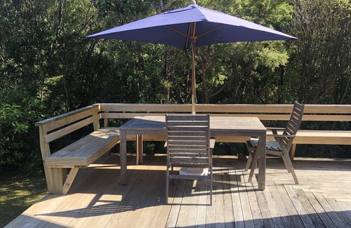 The bach is nestled among mature totara trees and is home to many native birds. It has a lovely open garden and an extensive view across the estuary which will fill up during spring high tides. It is only a 30 second walk across the other side of the road to a very safe swimming beach.
