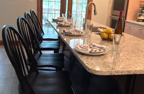 The adults enjoy this Main level of the house. The living room boasts a wood burning fireplace (available when outside temperatures are 50 and below), the 72" Sony Bravia high definition TV coupled with the Sony Bravia home theater surround sound system, Amazon FireSticks for streaming TV, cloth and leather furniture. The kitchen is open concept allowing the cooks to remain involved with the action in the living room, or friends may join the cooks by sitting at the kitchen four-seat island.