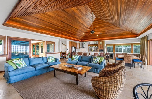 The vaulted living space at Hale Makai at Diamond Head leads to a grassy lawn surrounded by lush greenery, with the breathtaking ocean views giving you the real island experience right from your backyard. In addition to a private pool, the home comes equipped with a barbecue grill for casual meals at home.