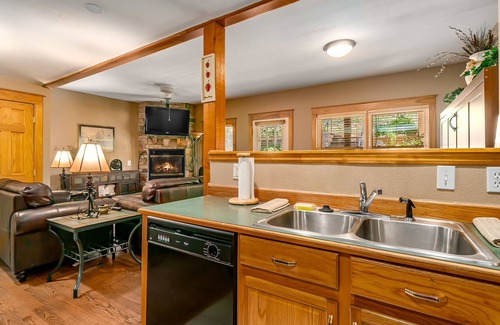 Hallett Peak 101 is a rustic 2BR/2BA condo with views of Mary's Lake and the Rocky Mountains. The open-concept living, dining and kitchen areas allow for easy family time, featuring full-size appliances, comfy couches, a fireplace and a flat-screen TV. The living area also cleverly conceals a queen-size Murphy bed.