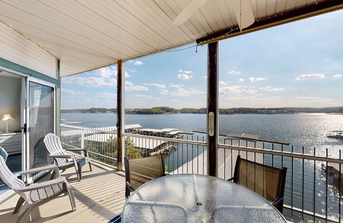 The magnificent view of Lake of the Ozarks will have you wishing you lived here. This condominium has 3 bedrooms and 2 bathrooms and enough room for the whole family to enjoy. This is not a good property for bachelor or bachelorette parties!!! The master suite is furnished with a king bed and a private bath and walk out screened in porch to enjoy the beautiful view. The second bedroom offers a queen bed and the kid’s room has a pyramid bunk bed (twin over full) and a trundle bed providing sleeping for 4 kids. The lakeview living area has a nice sectional and the kitchen is fully stocked, complete with a dishwasher, refrigerator and stove, plus coffee maker, blender and toaster. All you need are your beach towels, clothes and groceries. This unit has a washer and dryer in a separate laundry room. Enjoy the gorgeous main channel view of Lake of the Ozarks from the spacious lakeside deck . This condo has a BBQ gas grill on the side deck with a dining patio set on the main deck. The Harbour Towne complex has 2 swimming pools and tennis courts for your enjoyment. Located at the 2 mile marker by water and close to the historic Bagnell Dam Strip and Village Marina Boathouse Waterfront Restaurant. You are also not far from several of the favorite golf courses! Pack the bags, grab the kids, and come enjoy this 3rd floor Harbour Towne condo in beautiful Lake of the Ozarks! You can always book with confidence through Four Seasons Property Management, Lake of the Ozarks!